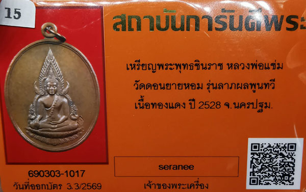 เหรียญพระพุทธชินราช หลวงพ่อแช่ม วัดดอนยายหอม รุ่นลาภผลพูนทวี เนื้อทองแดง ห่วงเดิม ปี2528 จ.นครปฐม + บัตรG-pra สภาพสวยเดิมค่ะ |