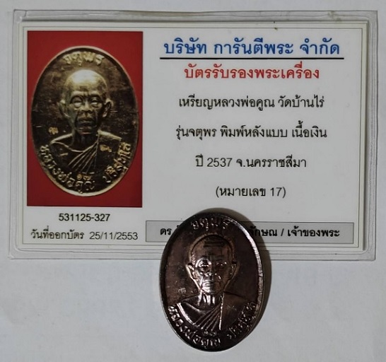เหรียญหลวงพ่อคูณ รุ่น จตุพร ปี 2537 เนื้อเงิน หลังแบบ หมายเลข 17 สภาพสวยเดิม จำนวนการสร้างเพียง 330 เหรียญ