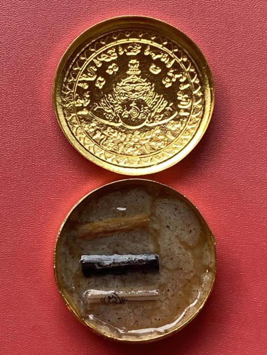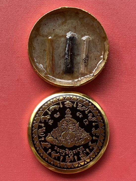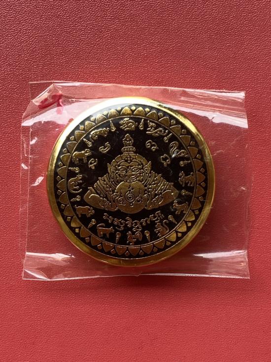 เคาะเดียวแดง สีผึ้งพระราหู รุ่น มงคลจักรวาล เนื้อ โลหะชุบทองลงยาสีดำขอบสีดำ ขนาด5ซม |