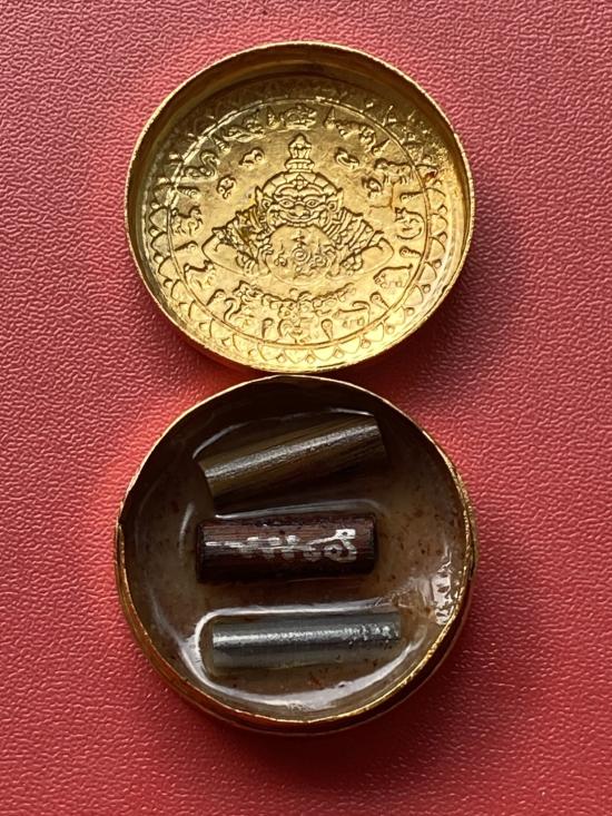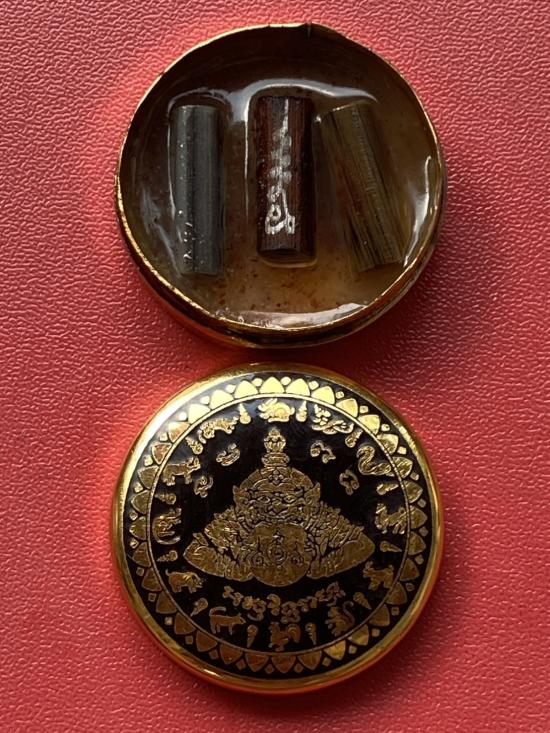 เคาะเดียวแดง สีผึ้งพระราหู รุ่น มงคลจักรวาล เนื้อ โลหะชุบทองลงยาสีดำขอบสีดำ ขนาด3.2ซม |