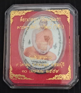 ล็อกเก็ต รุ่นแรก พระครูปลัดวิชัย วัดสันติวิหาร สระบุรี ด้านหลังจารยันต์ หมายเลข ๑๖๒๒ กล่องเดิม |