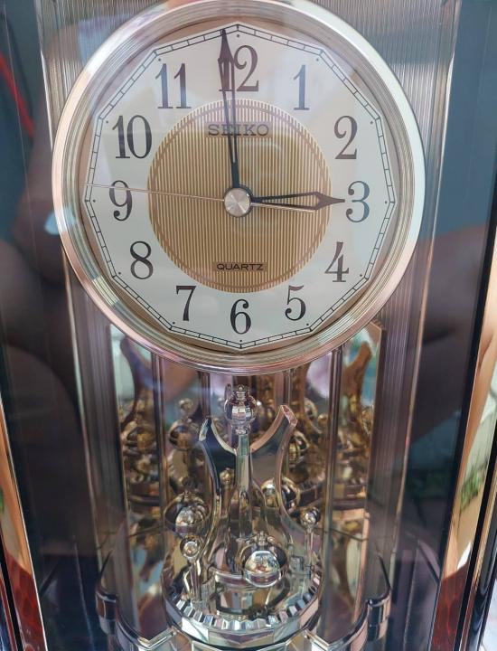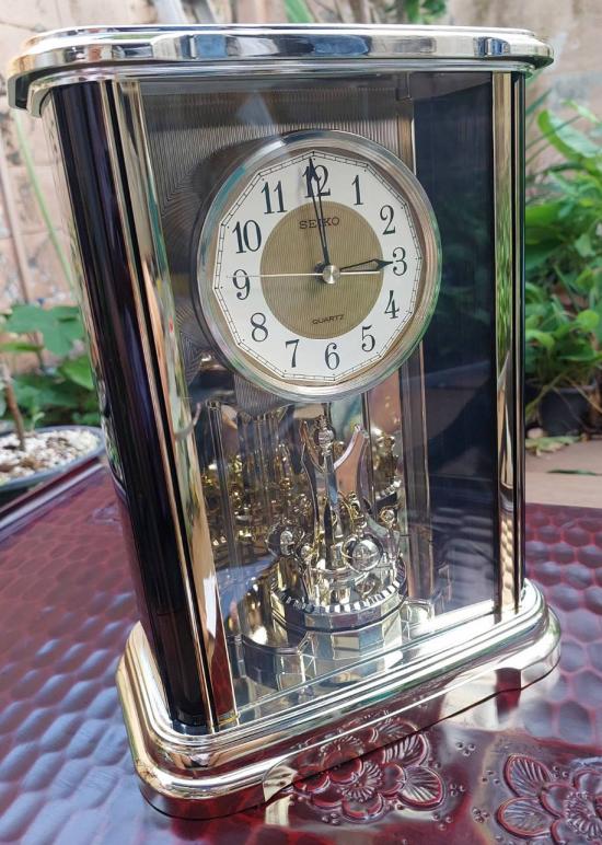 นาฬิกาตั้งโต๊ะโบราณยี่ห้อ Seiko รุ่นที่มีตุ้มเหวี่ยงแบบหมุน สภาพใหม่แกะกล่อง มีใบรับประกัน และคู่มือ