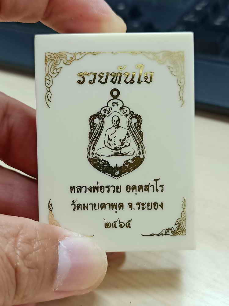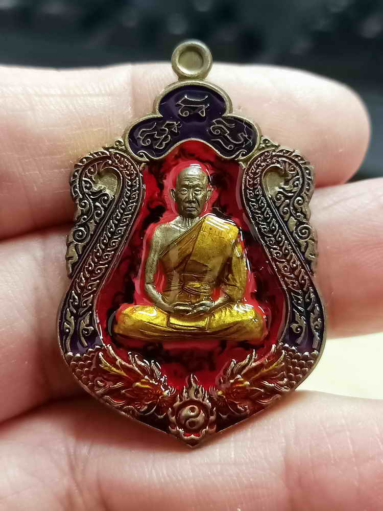 วัดใจ 100 เหรียญเสมารวยทันใจ หลวงพ่อรวย วัดมาบตาพุด จ.ระยอง ปี 2565 ชนวนโบราณ ลงยาแดง ขอบ จีวร หมายเลข 122 กล่องเดิม