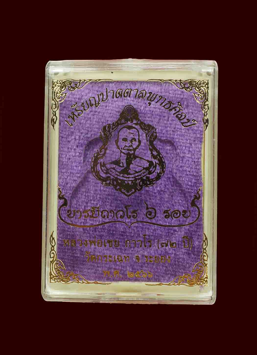 เหรียญปาดตาล รุ่น บารถาวโร 6 รอบ ด้านหน้าตอกโค๊ต หลวงพ่อเชย วัดกระเฉท ระยอง เนื้อทองทิพย์ คุ้ยพื้นลงยาพื้นแดงโบว์สีน้ำเงิน จีวรเหลือง สร้างน้อย 200 เหรียญ หมายเลข 2 หลัก **92*** พร้อมกล่องเดิมจากวัด