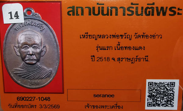 เหรียญหลวงพ่อขวัญ วัดท้องอ่าว รุ่นแรก เนื้อทองแดง ปี2518 จ.สุราษฎร์ธานี + บัตรG-pra สภาพเดิมค่ะ สภาพตามรูปทุกประการค่ะ