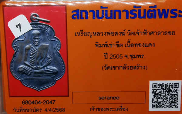 เหรียญรุ่นแรก หลวงพ่อสงฆ์ วัดเจ้าฟ้าศาลาลอย พิมพ์เข่าขีด เนื้อทองแดง ห่วงเดิม ปี2505 จ.ชุมพร(วัดเขากล้วยสร้าง)+ บัตรG-pra สภาพเดิมค่ะ สภาพตามรูปทุกประการค่ะ