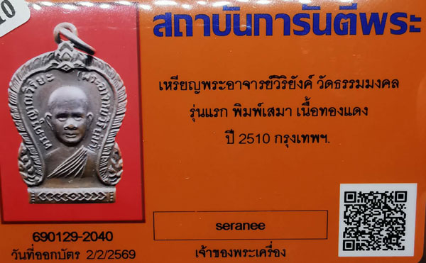 เหรียญพระอาจารย์วิริยังค์ วัดธรรมมงคล รุ่นแรก พิมพ์เสมา เนื้อทองแดง ห่วงเดิม ปี2510 กรุงเทพฯ + บัตรG-pra สภาพเดิมค่ะ สภาพตามรูปทุกประการค่ะ