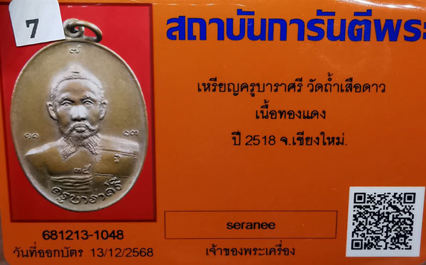 เหรียญครูบาราศรี วัดถ้ำเสือดาว เนื้อทองแดง ห่วงเดิม ปี2518 จ.เชียงใหม่ + บัตรG-pra สภาพเดิมค่ะ |