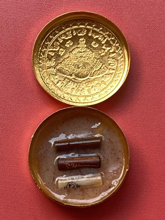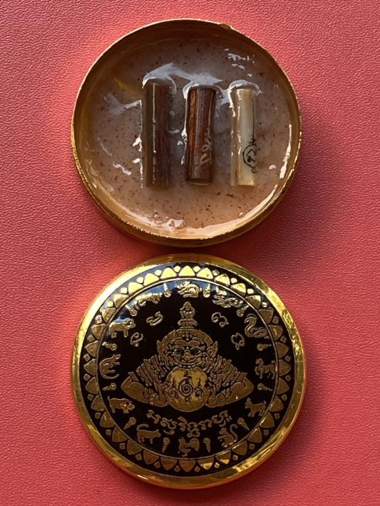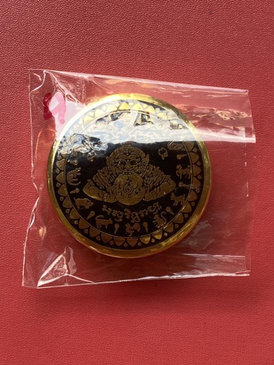 เคาะเดียวแดง สีผึ้งพระราหู รุ่น มงคลจักรวาล เนื้อ โลหะชุบทองลงยาสีดำขอบสีดำ ขนาด5ซม |