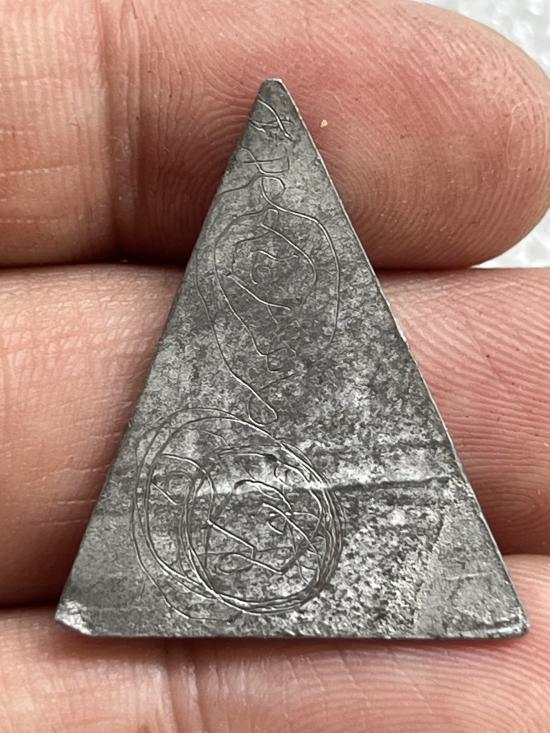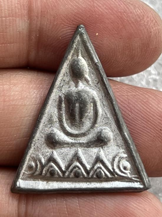 เหรียญสามเหลี่ยมเนื้อตะกั่ว พิมพ์พระพุทธ หลังจารย์มือ ไม่ทราบที่