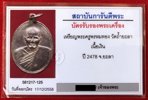 เหรียญรุ่นแรก พระครูพรหมทอง วัดคูหาภิมุข ( วัดถ้ำยะลา ) พิมพ์นิยม ( เนื้อเงิน ) ปี 2478 จ.ยะลา สภาพสวย หูเชื่อมเดิมๆ มาพร้อมบัตรรับรองครับ