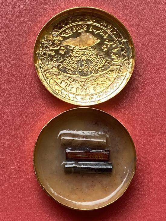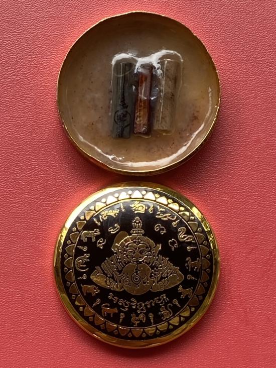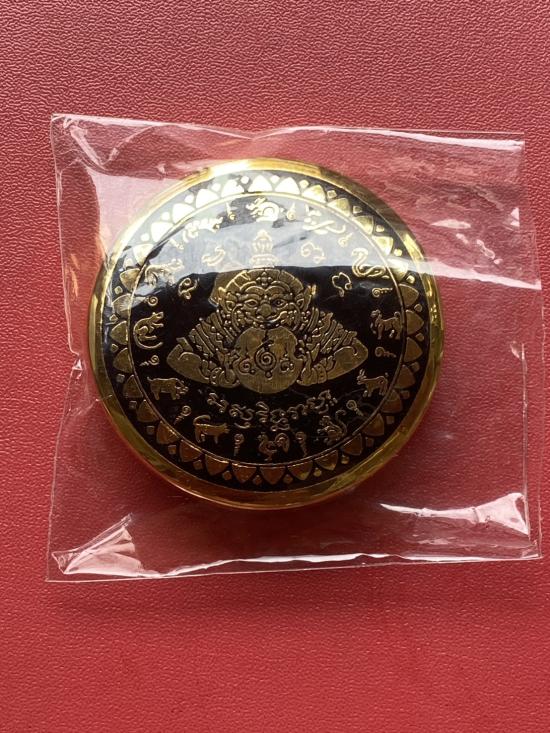 เคาะเดียวแดง สีผึ้งพระราหู รุ่น มงคลจักรวาล เนื้อ โลหะชุบทองลงยาสีดำขอบสีดำ ขนาด5ซม |