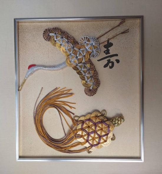 เหรียญ 5 เยน ทำเป็นเครื่องรางนำโชค งานฝีมือแบบญี่ปุ่นดั้งเดิม โดยมีนกกระเรียน (สึรุ) และเต่า (คาเมะ) ซึ่งเป็นสัญลักษณ์ของอายุยืนยาวและความโชคดี