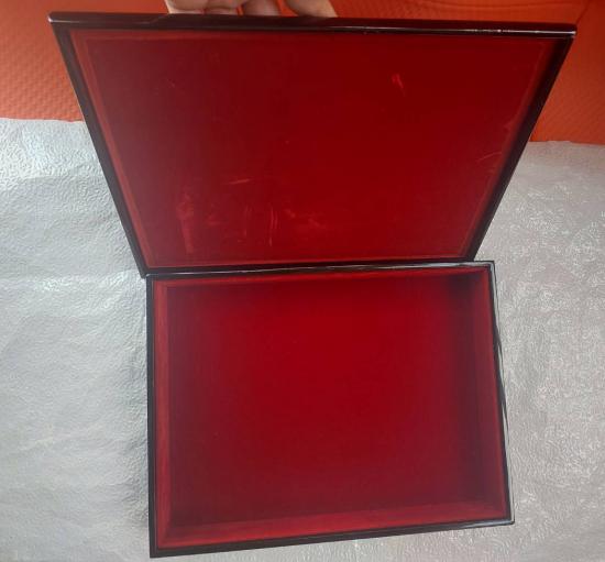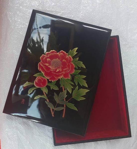 กล่องไม้เครื่องเขินญี่ปุ่น (Japanese lacquerware) ประเภทวาจิมะ-นูริ (Wajima-nuri) ลายดอกโบตั๋น ซึ่งเป็นสัญลักษณ์ของความมงคล บุสักหลาดอย่างดี ขนาด 9.5*12นิ้ว หนา 2.5 นิ้ว