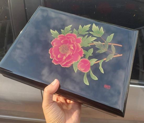 กล่องไม้เครื่องเขินญี่ปุ่น (Japanese lacquerware) ประเภทวาจิมะ-นูริ (Wajima-nuri) ลายดอกโบตั๋น ซึ่งเป็นสัญลักษณ์ของความมงคล