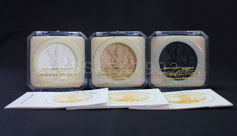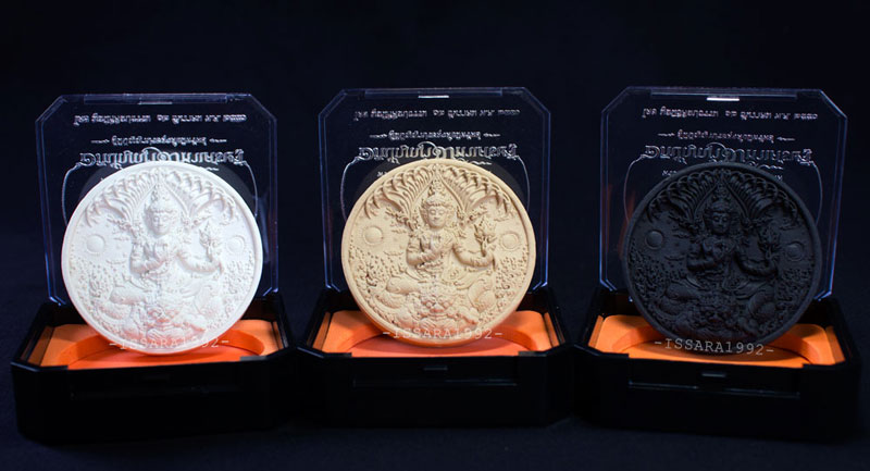 กราบขออนุญาตท่านอ.เฉลิมชัย โฆษิตพิพัฒน์ นำเสนอ อภิปัญญามหาเศรษฐี พิมพ์ใหญ่ ขนาด 5.5 ซม. เนื้อผงพุทธคุณ 1 ชุด สามสี พร้อมกล่องเดิม