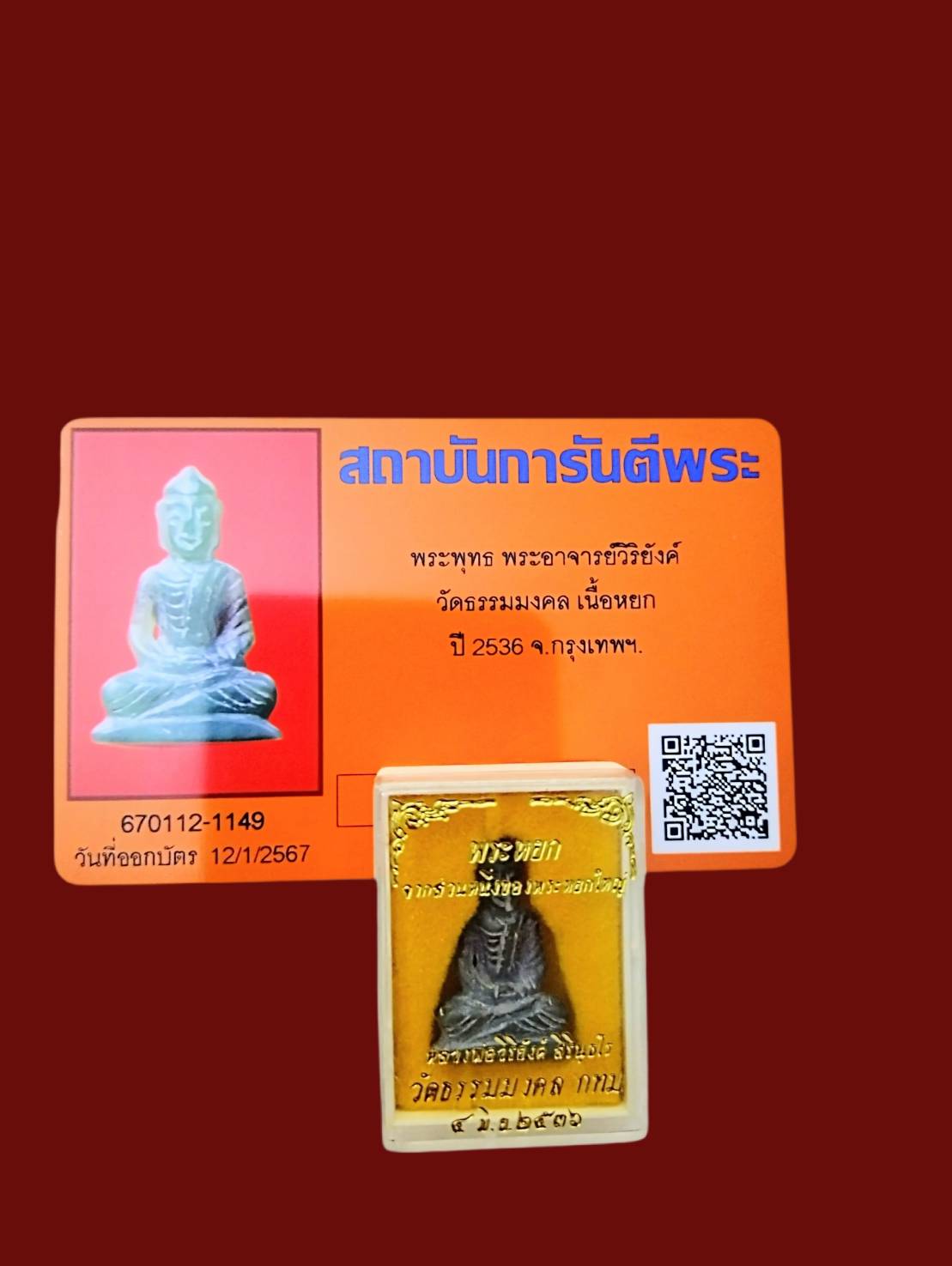 พระพุทธ พระอาจารย์วิริยังค์ วัดธรรมมงคล เนื้อหยก ปี 2536 สวยเดิม กล่องเดิม มาพร้อมบัตรรับรอง