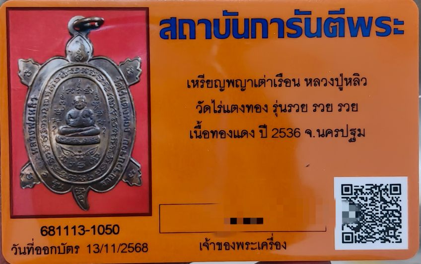 เหรียญพญาเต่าเรือน หลวงปู่หลิว วัดไร่แตงทอง รุ่น รวย รวย รวย เนื้อทองแดง ปี2536 จ.นครปฐม +บัตรรับรอง
