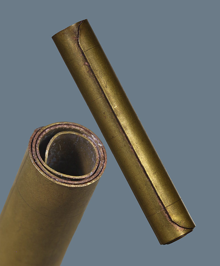 วัดใจ**เครื่องราง ตะกรุดเนื้อฝาบาตรเก่า*{ มีรอยจารนอกจารใน }*ยาว 2.นิ้ว ไม่ทราบที่....เดิมๆครับ