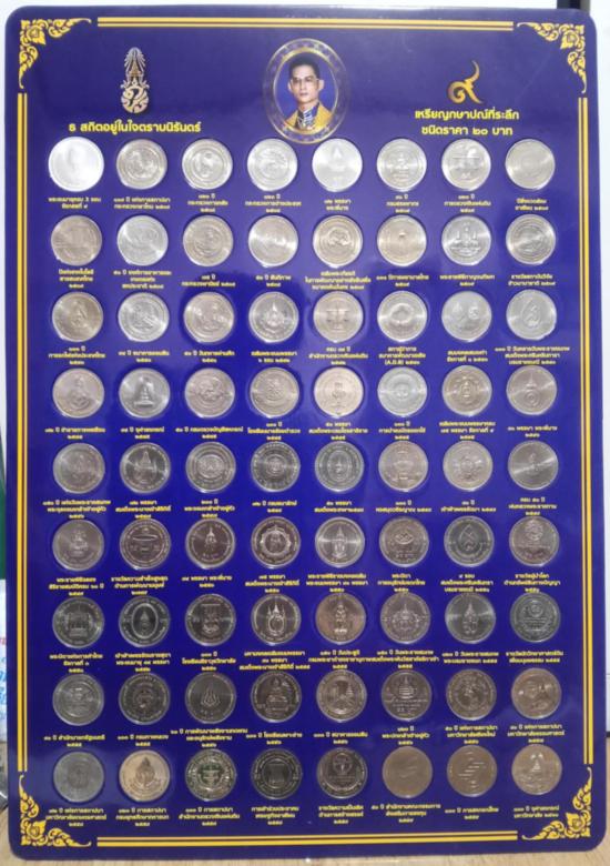 แผงพร้อมเหรียญ 20 นิเกิลชนิดราคา 20 บาท+เหรียญเงิน 20 บาท 3 รอบ ในสมัยรัชกาลที่ 9 ครบทุกวาระ 71วาระ+เหรียญเงิน ทั้งหมดรวม 72 วาระ เหรียญสภาพไม่ผ่านการใช้งาน พร้อมแผงสีน้ำเงิน จำนวน 1 แผง ครับ