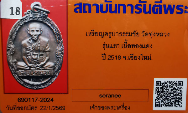 เหรียญครูบาธรรมชัย วัดทุ่งหลวง รุ่นแรก เนื้อทองแดง ห่วงเดิม ปี2518 จ.เชียงใหม่ + บัตรG-pra สภาพเดิมค่ะ