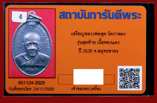 เหรียญหลวงพ่อสุด วัดกาหลง รุ่นสุดท้าย เนื้อทองแดง ปี 2526 จ.สมุทรสาคร พร้อมบัตร No.2029