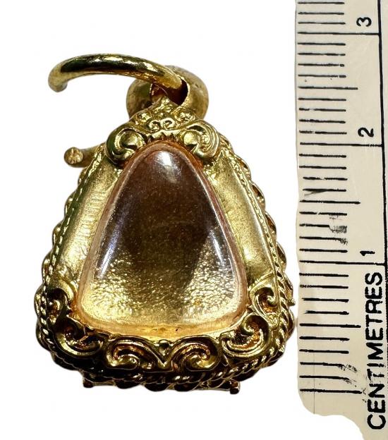 ตลับมือสองโลหะชุบทองหนาทรงสามเหลี่ยมใส่พระปิดตาจิ๋วได้ ขนาด 1.5 x 1.5 ซม. |