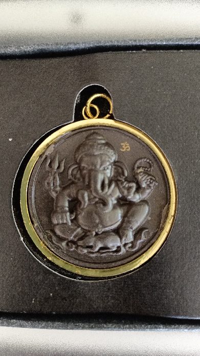 เหรียญพระพิฆเนศ หลังเทพจำแลง เนื้อแร่ควอนตั้ม ครูบากฤษณะ วัดป่ามหาวัน เหรียญขนาด เส้นผ่านศูนย์กลาง 4 เซนติเมตร เลี่ยมไมครอนพร้อมใช้ หมายเลข "3438" พร้อมกล่องเดิม ราคาตอนออกให้บูชา 3,999.-