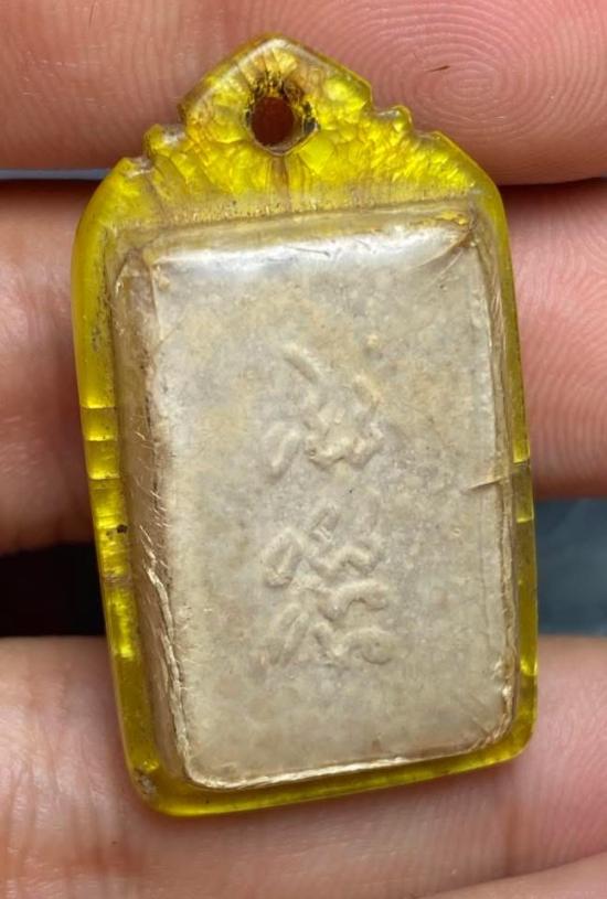 พระเนื้อผงรูปเหมือนเนื้อเก่า ด้านหลังมียันต์ พร้อมเลี่ยมห้อยใช้เก่าๆ มีคราบหิ้ง/ฝุ่นผงติด ไม่ทราบที่ครับ