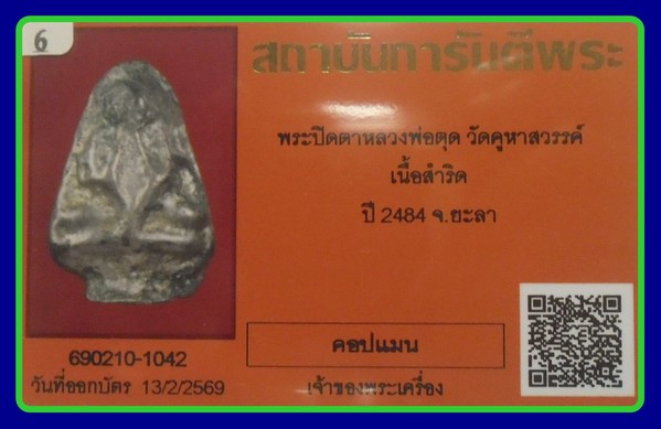 บัตรการันตี -2700-พระปิดตา หลวงพ่อตุด วัดคูหาสวรรค์ จ.พัทลุง เนื้อสำริดเงิน พศ.2483
