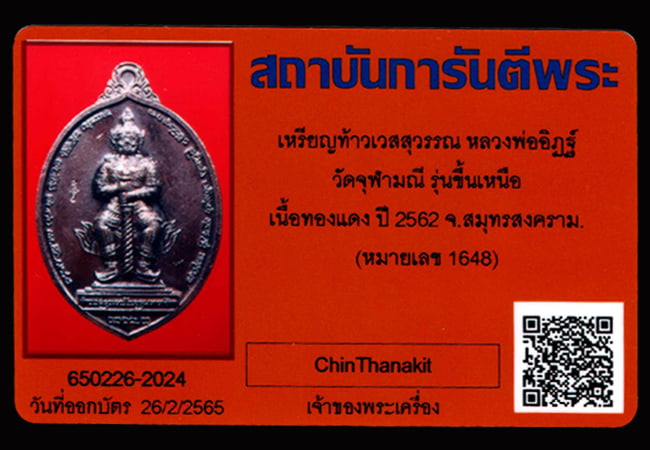 เหรียญท้าวเวสสุวรรณ วัดจุฬามณี รุ่น ขึ้นเหนือ เนื้อทองแดง (หมายเลข 1648) ปี2562 พร้อมบัตร QR-Code |