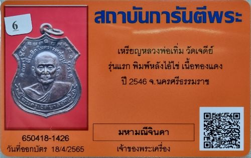 เหรียญพลิกชีวิต พ่อท่านเทิ่ม หลังไอ้ไข่ วัดเจดีย์ ปี 2546 หายาก 1 ใน 3,000 สวย พร้อมบัตรรับรองครับ