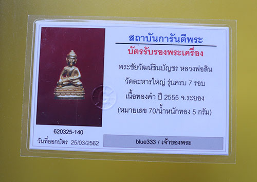 พระชัยวัฒน์ชินบัญชร รุ่นครบ7รอบ เนื้อทองคำ หลวงพ่อสิน วัดละหารใหญ่ หมายเลข ๗o ปี 2555 สวยมาก