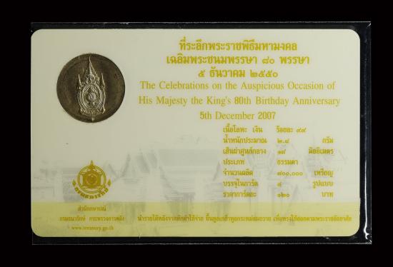 3.เหรียญที่ระลึก พระราชพิธีมหามงคลเฉลิมพระชนมพรรษา 80 พรรษา ปี2550 ((( เนื้อเงิน ))) UNC *บรรจุในการ์ด*