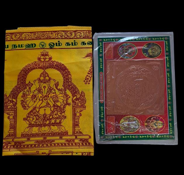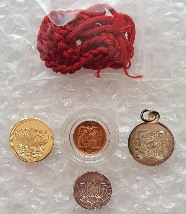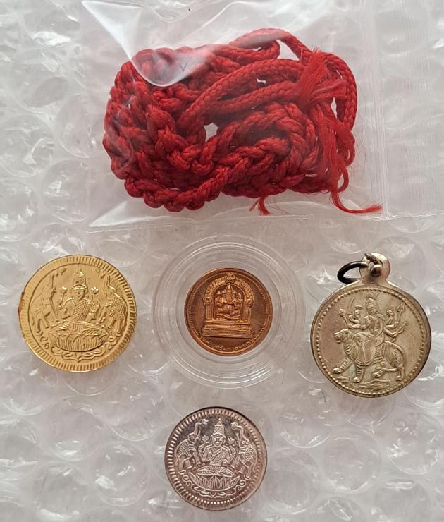 เหรียญพระพิฆเนศ ทองแดงปัดเงาขนาด 1.5 ซม 1 เหรียญ เหรียญนิเกิ้ลแม่พระลักษมี ขนาด 1.5 ซม 1เหรียญ เหรียญบรอนทอง แม่พระลักษมี 2 ซม 1เหรียญ เหรียญนิเกิ้ล แม่พระอุมา ขนาด 2 ซม.พร้อมเชือกแดง 1 เหรียญ แผ่นบูชาหลังทองแดง 1 แผ่น และผ้ายันต์พระพิฆเนศ 1 ผืน |