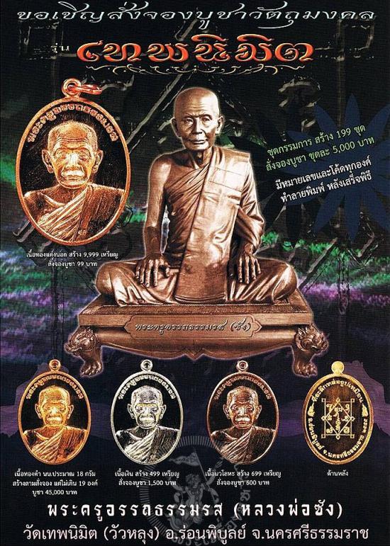 พระครูอรรถธรรมรส หรือที่รู้จักกันดี ในนามสมภารซัง(พ่อท่านซัง สุวัณโณ )อดีตเจ้าอาวาสวัดวัวหลุงผู้โด่งดัง ปี2555 ได้มีการจัดสร้างวัตถุมงคลรุ่นใหม่มีชื่อว่า รุ่นเทพนิมิต ซึ่งจัดสร้างโดยนายธำรง เขมะรัตน์ นายอำเภอร่อนพิบูลย์คนปัจจุบัน วัตถุประสงค์ในการสร้างเพื่อ หล่อรูปเหมือนพ่อท่านซังหน้าตัก 32 นิ้ว บูรณศาลาหน้าที่ว่การอำเภอเพื่อประดิษฐานรูปหล่อพ่อท่านซัง บูรณกุฎิหลังเก่าที่สร้างในสมัยพ่อท่านซังยังมีชีวิต สมทบกองทุนดูแลสุขภาพของเจ้าอาวาสวัดวัวหลุงรูปปัจจุบัน รูปแบบสวย พิธีพุทธาภิเษกเข้มขลังโดยพระเกจิสายใต้ ๑๐ รูป ณ อุโบสถวัดเทพนิมิต(วัดวัวหลุง) วันศุกร์ที่ ๓๑ กรกกฎาคม ๒๕๕๕ รุ่นนี้ขอแนะนำน่าสะสมเป็นอย่างยิ่ง!!
