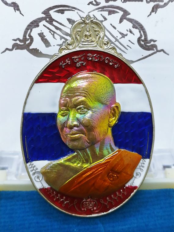 เหรียญหันข้าง รุ่น รวยเจริญไพศาล หลวงพ่อรวย อคฺคสาโร วัดมาบตาพุด อ.เมือง จ.ระยอง เนื้ออัลปาก้า หน้ากากทองทิพย์ผิวรุ้ง ลงยาลายธงชาติ (ชุดกรรมการ) หมายเลข 171