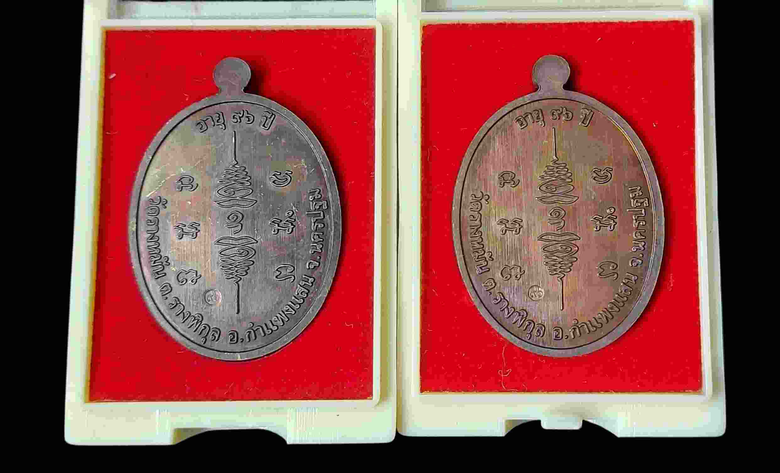 วัดใจเคาะเดียวแดง 2องค์ เหรียญเจริญพรบน อายุ ๙๖ ปี ๘ รอบ หลวงปู่แผ้ว วัดรางหมัน เนื้อทองแดงสภาพสวยพร้อมกล่องเดิม