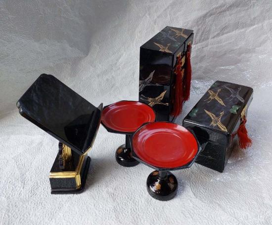 ***วัดใจ 5 ชิ้น***เครื่องบูชาที่วางหนังสือสวดมนต์แบบญี่ปุ่น (Kyobon-Dai หรือ Kakocho-dai)พร้อมพานเล็ก กับเซตตู้+กล่องสมบัติชิ้นเล็ก งานสำหรับตั้งโชว์ญี่ปุ่น