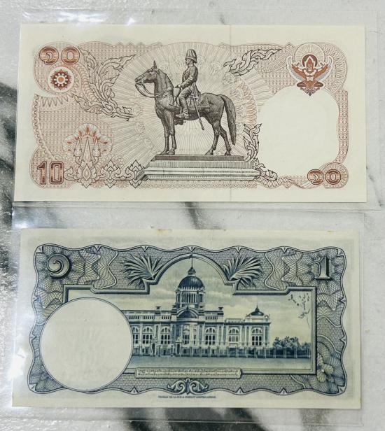 ชุด 2 ใบ ธนบัตร 10 บาท ร.9 หลังพระบรมรูปทรงม้า และ 1 บาท โทมัส ลายน้ำพาน |