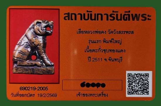 เสือหลวงพ่อคง วัดวังสรรพรส รุ่นแรก พิมพ์ใหญ่ เนื้อตะกั่วชุบทองแดง ปี 2511 จ.จันทบุรี พร้อมบัตรG...