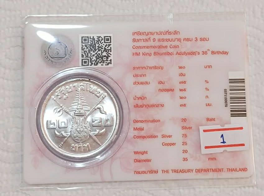 ชื่อพระเครื่อง เหรียญกษาปณ์ ชนิดราคา 20 บาท ในหลวงร.9 พระชนมายุครบ 3 รอบ ปี2506 ((( เนื้อเงิน ))) 3.5 ซม. หนัก 20 กรัม สภาพไม่ผ่านใช้ จำนวน 1 เหรียญ ครับ #1#