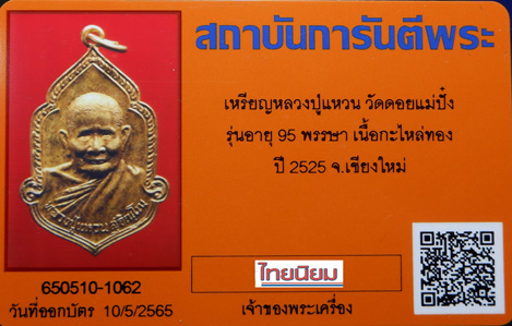 เหรียญหลวงปู่แหวน ๙๕ พรรษา กะไหล่ทอง วัดดอยแม่ปั๋ง จังหวัดเชียงใหม่ ปี๒๕๒๕ + บัตรรับรอง G-Pra |