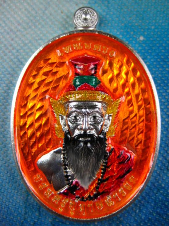 เหรียญฤาษีนารอด หลวงพี่เลี้ยง วัดจอมเกษ เนื้อชุบเงิน พื้นส้ม ลงยาองค์ฤาษี พร้อมกล่องเดิม(---A48---) |