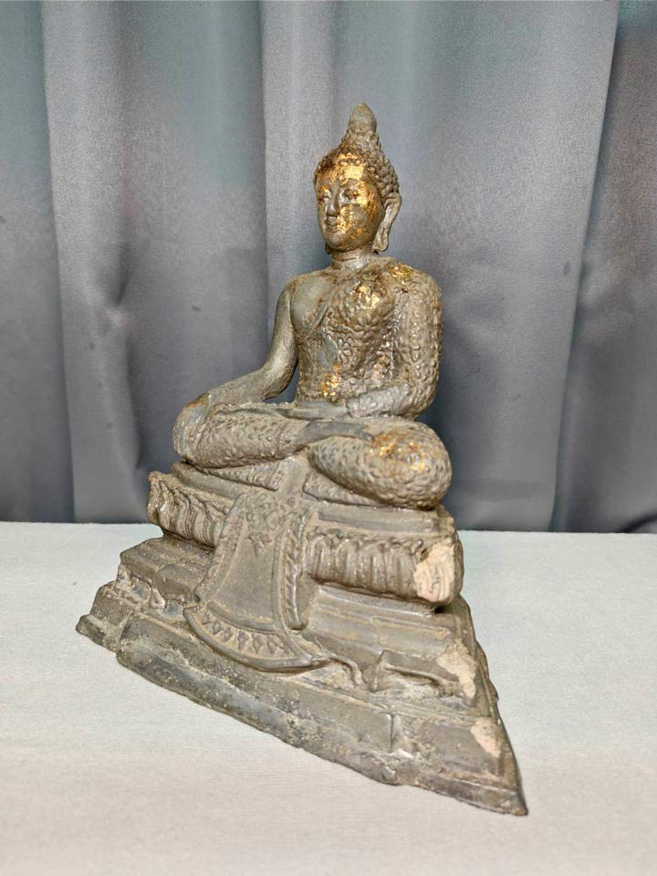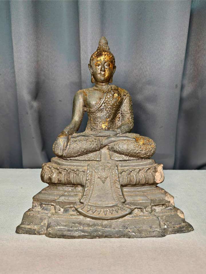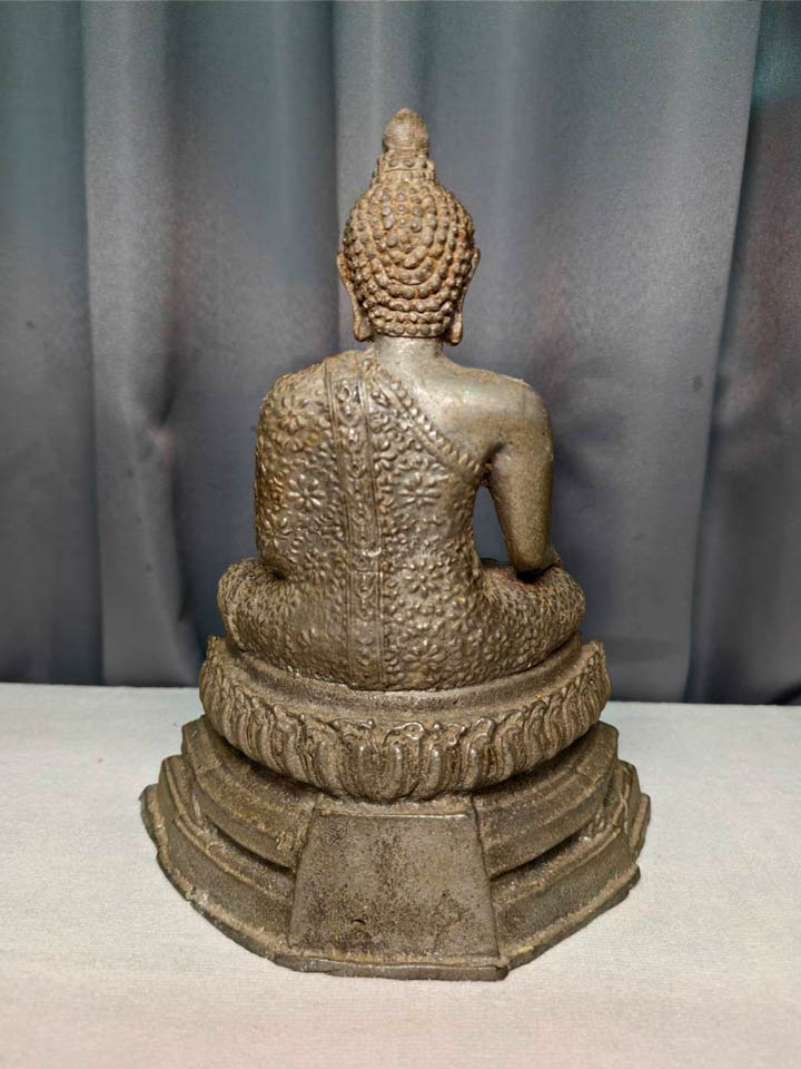 พระบูชาจีวรดอกพิมพ์มารวิชัย เนื้ออลูมิเนียมขาปิ่นโต ขนาดหน้าตัก 5 นิ้ว ฐานอุดปูนผสมผง