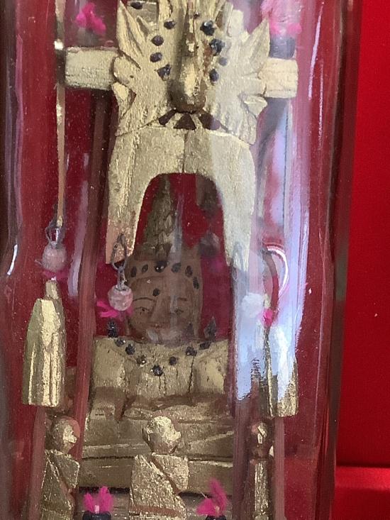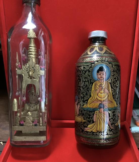 ชื่อพระเครื่อง (เคาะเดียวแดง) พระมหามุนี กับภาพวาด พระพุทธเจ้ากับอัครสาวก ในขวดแก้ว งานฝีมือจากพม่า
