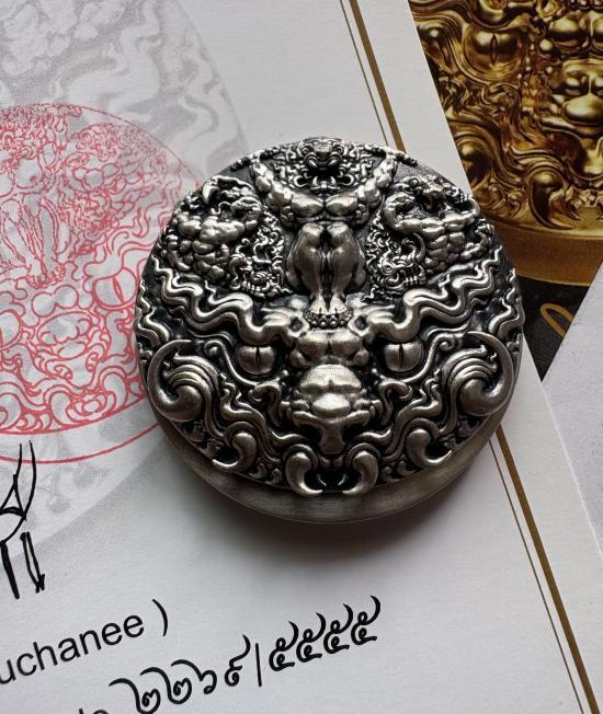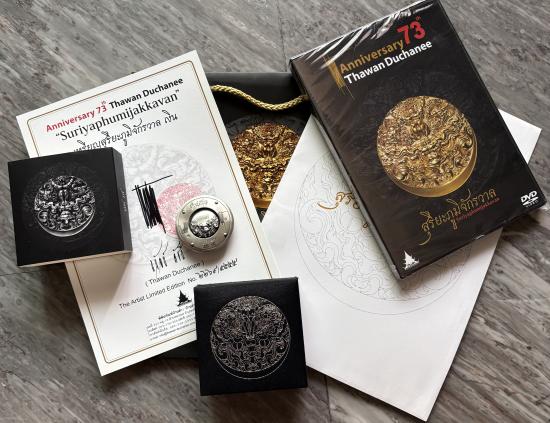กราบขออนุญาตท่านอ.เฉลิมชัย โฆษิตพิพัฒน์ นำเสนอ เหรียญสุริยะภูมิจักรวาล สร้างโดยอาจารย์ ถวัลย์ ดัชนี (ศิลปินเเห่งชาติ) เนื้อเงิน ผลงานมาสเตอร์พีส หมายเลขสวย 2269 พร้อมอุปกรณ์ครบชุด กล่องใน-กล่องนอก,ใบเซอร์ลายเซ็นจริง พร้อมซอง ถุงกระดาษ ซีดีพร้อมหนังสือประวัติเหรียญซึ่งยังไม่ได้แกะซีลเดิมออก แบ่งปันให้นำไปสะสมกันครับ