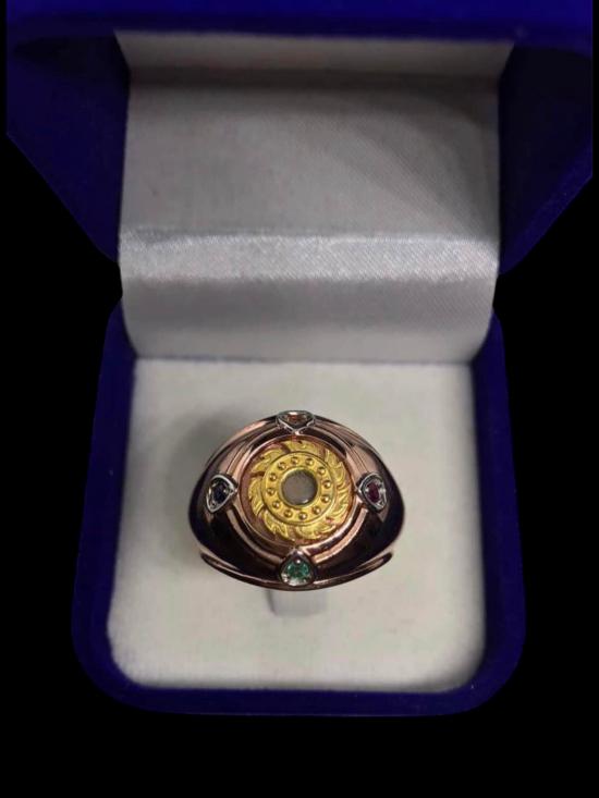 พรหมประสิทธิ์ แหวนมหาจักร มวลสารร้อยล้าน เนื้อสัตตะชุบพิงค์โกล์ จักรมวลสาร ฝังอัญมณี ทับทิม,ไพลิน,บุษราคัม,มรกต ของเสี่ย อั๋น โอกิ จักรหมุนได้ มวลสารร้อยล้านบาท หมายเลขสวย ๒๖๓๒เส้นผ่าศูนย์กลางวงในขนาด