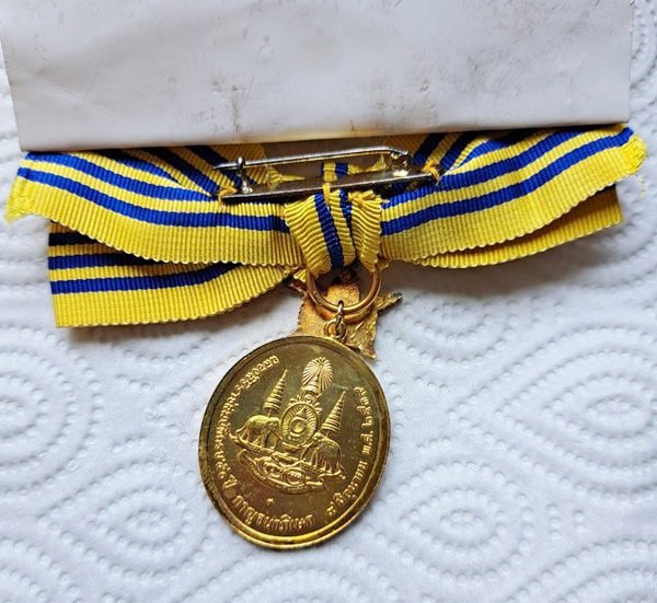 เหรียญที่ระลึกประดับแพรแถบ พระราชพิธีฉลองสิริราชสมบัติครบ 50 ปี ( กาญจนาภิเษก ) ปีพุทธศักราช 2539 เนื้อเงิน กะไหล่ทอง (สตรี) |