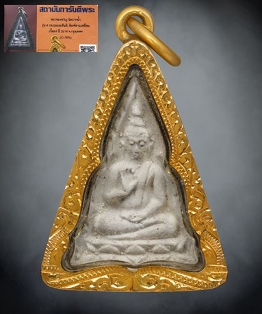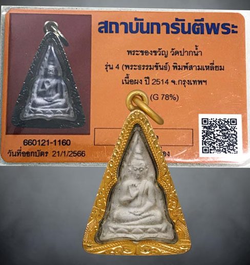 พระผงของขวัญ วัดปากน้ำ จ.กรุงเทพฯ รุ่น 4 พิมพ์สามเหลี่ยม สร้างปี2514 พร้อมเลี่ยมกรอบทองคำแท้หนาๆ 78% (น้ำหนักพระรวมทอง8.16กรัม)มาบัตรการันตีพระแท้แน่นอนครับท่าน